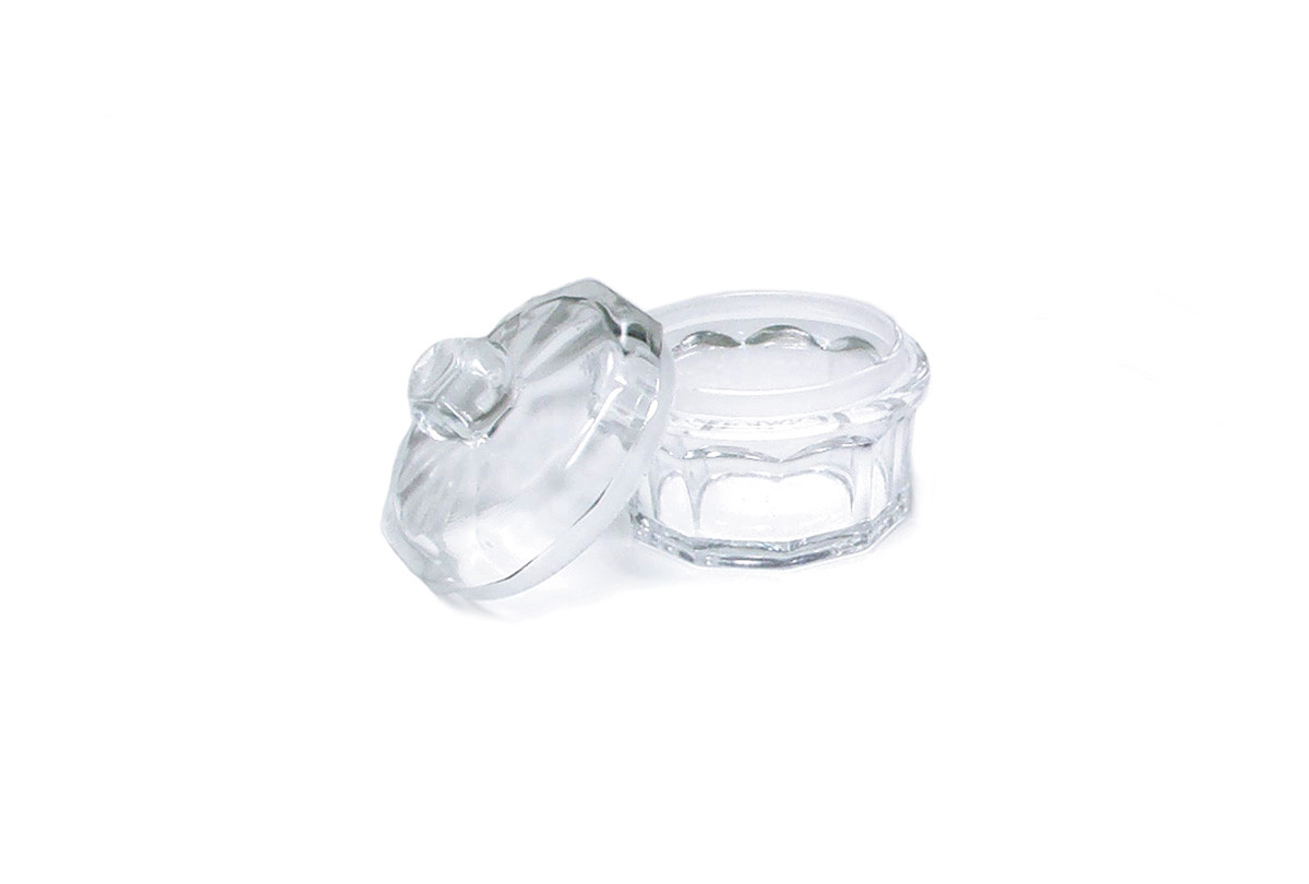 Clear Glass with Knob. Outside diameter 3-1/4″, height 2-3/8″, capacity 3-1/2 oz.