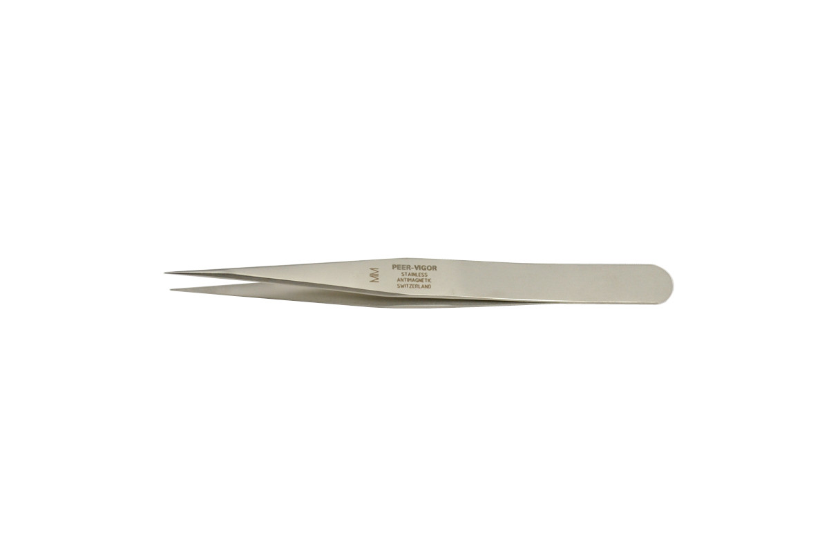 Boley style tweezers are excellent general utility tweezers. Shanks are tapered and have beveled edges. Similar to pattern AA, but heavier. The shanks are slightly longer and the corner of the handle has been rounded. Overall length 5 inches (127 mm).