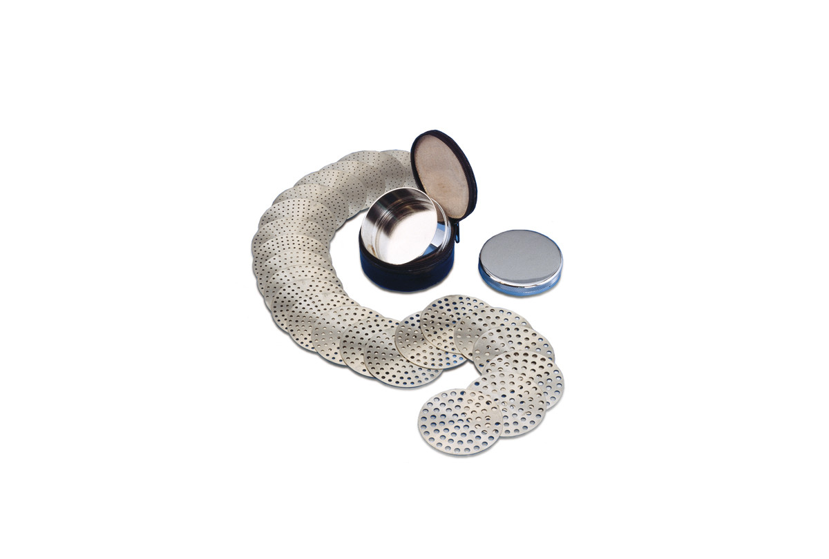 Hand-made sieves to sort rough and polished diamonds. Complete set supplied in zippered carrying case. Chart shows plate size of stones per carat; weight and size in millimeters. Each with 21 plates, 0-20. 2 5/8″ diameter.