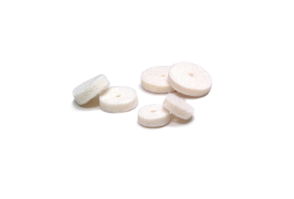 Solid felt wheel assortment includes 1/2″, 5/8″, and 3/4″ diameter wheels in the soft grade. For use with a mandrel.