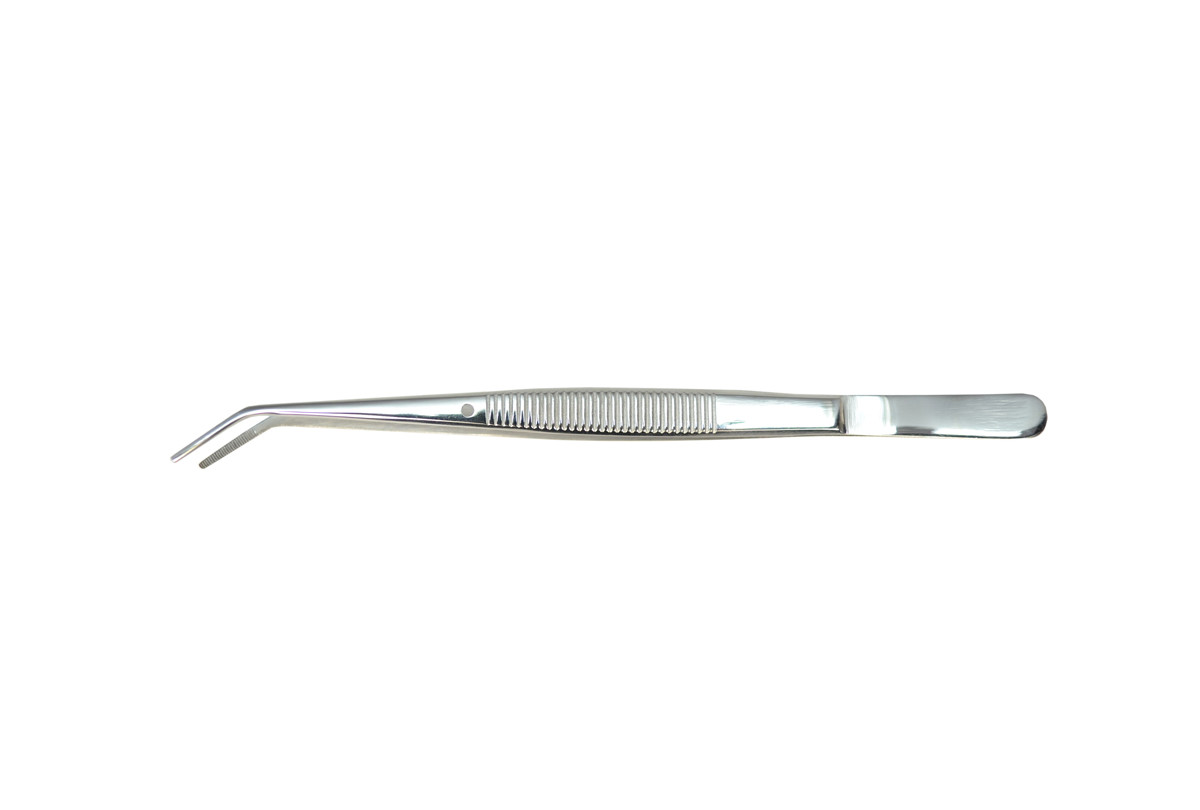 Forged from the best grades of stainless steel, machined to a smooth finish. Extensive hand finishing insures proper shape and alignment of the points, tips and shafts. Curved tips are ideal for many operations where small parts need to be precisely placed. These tweezers have serrated points.