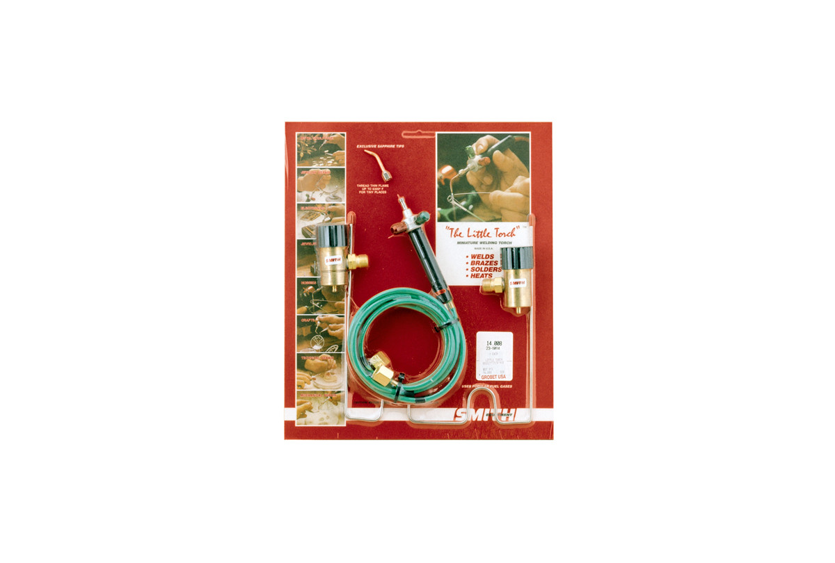 One tip kit for disposable tanks includes torch, hoses, pre-set oxygen regulator, pre-set propane regulator, size 4 curved tip, tank rest and instructions. Packaged on display card.