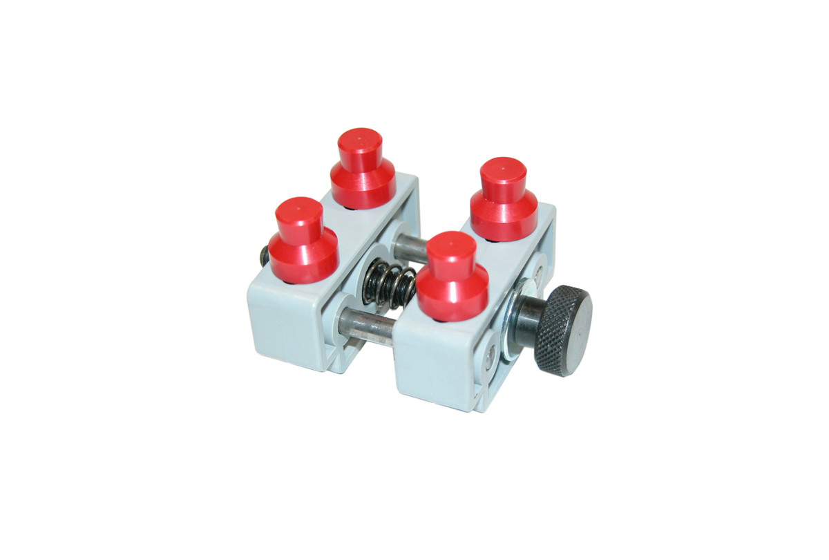 Has plastic posts to prevent marring. Posts are removable and can be set into different positions for different cases. Opens and closes with large knurled knob. Plastic frame fits into bench vise. Case vise 50 x 45 x 35.