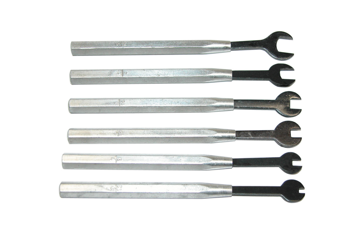 Six steel wrenches, with smooth black oxide finish and set in aluminum hex handles. Set is supplied with the following sizes: