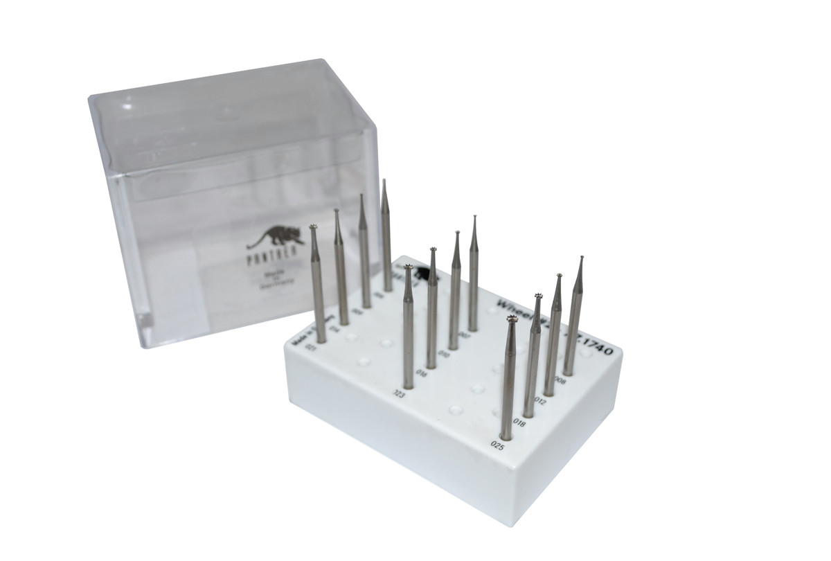 Set of 12 burs, sizes 006, 007, 008, 009, 010, 012, 014, 016, 018, 021, 023 and 025. 3/32″ shank.