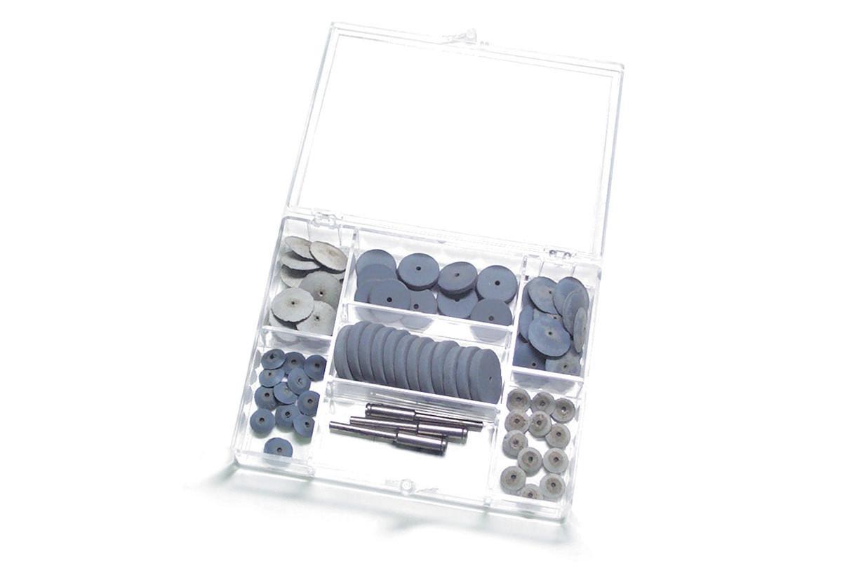 Kit includes 12 wheels each of all six styles and 3 mandrels with 1/8″ shanks. For cleaning, polishing and finishing. Made from natural rubber with graded pumice grain evenly distributed to assure uniform results. The light action produces a smooth finish on soft metals.