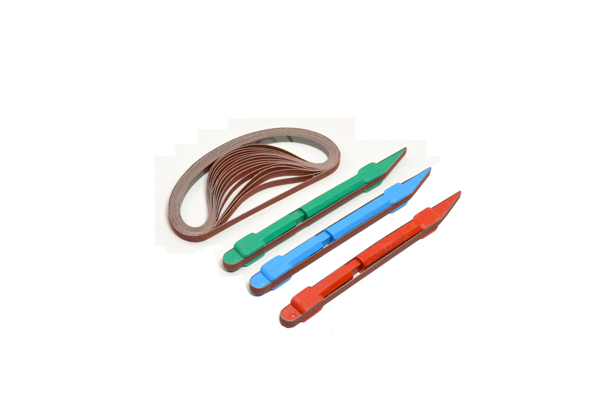 Fast, easy, economical way to reach detailed, hard-to-reach areas. Plastic stick, tapered at the end, holds a replaceable 1/4″ wide sanding belt. The aluminum oxide belt is held in place by a patented spring-loaded mechanism that allows the belt to be rotated 360°. Rotating the belt exposes a new sanding surface and allows the entire belt to be used.