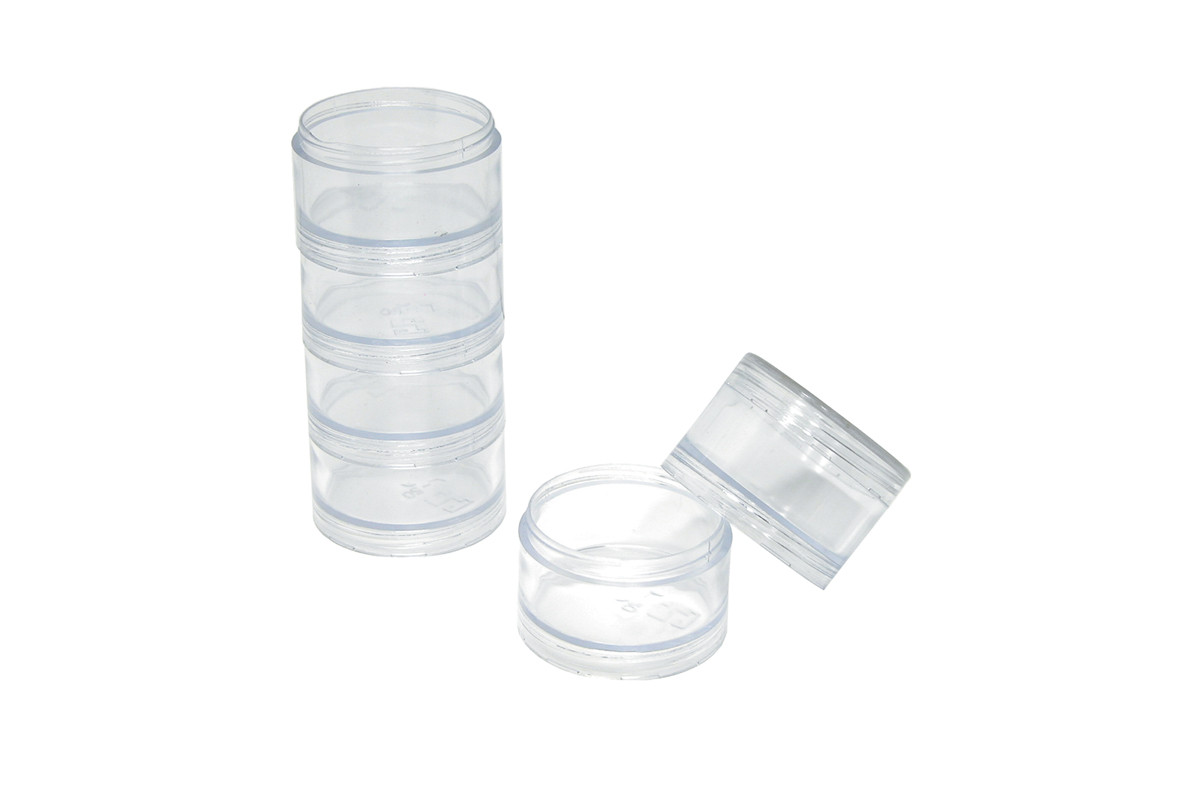 Trays have threaded bottoms that securely screw to the tray below allowing access to any tray at any level. Translucent plastic. Each tray measures 1″ in height and 2″ in diameter.