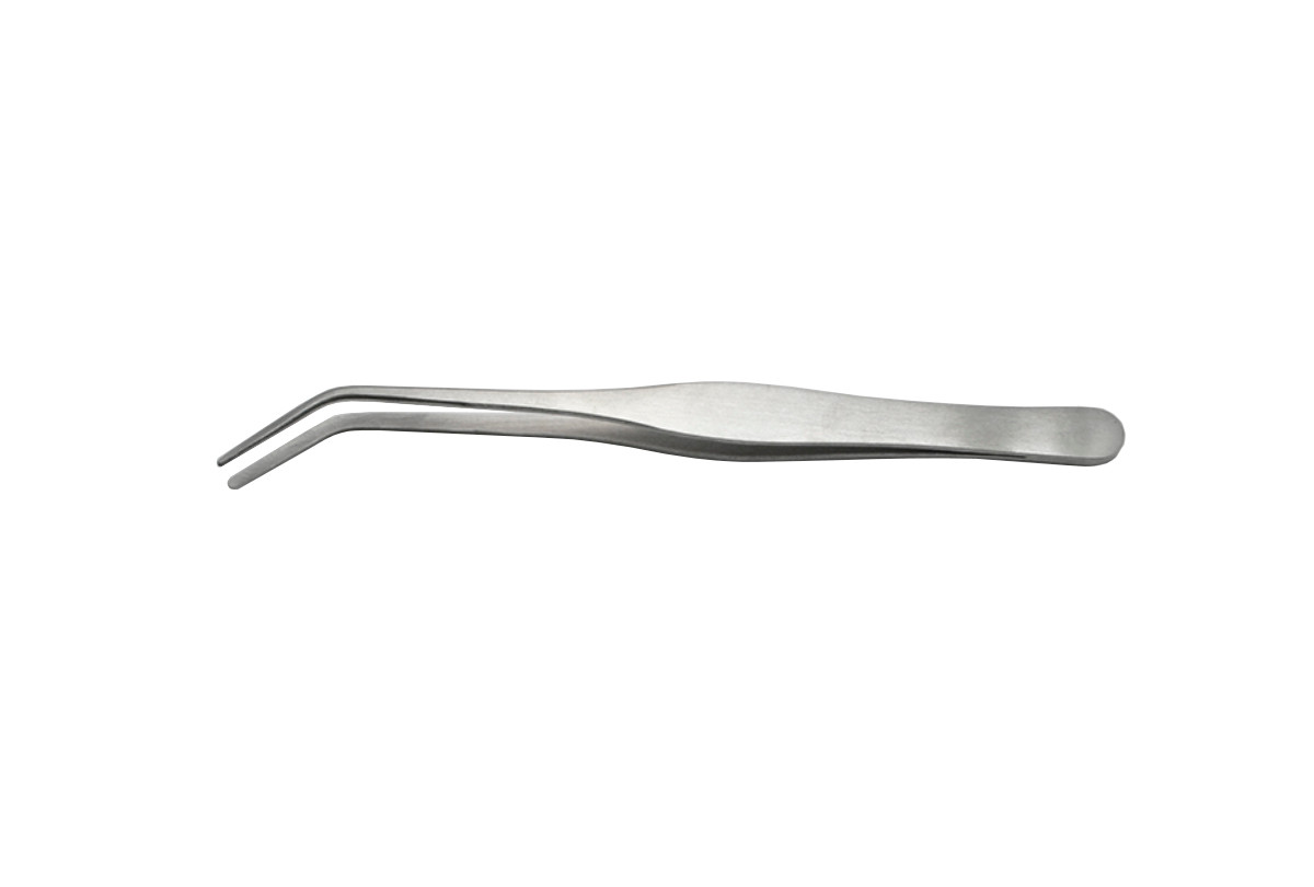 Heavier duty tweezers. Selection of a solder/utility tweezers involves overall length desired, shape and size of points, with or without serrations, etc. With curved points. Points are wedge/smooth.