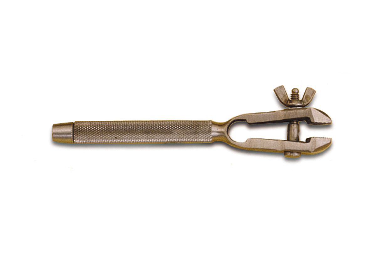 Serrated, grooved, spring action jaws open and close with large wing nut. Handles are hollow so that long wire will pass through. Two jaw widths are available. Both open to 1/4″. Overall length is 4-1/2″.